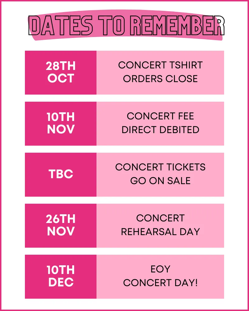 If there is any reason why your child will not be able to perform at the concert on the dates and times provided, please let us know so we can make amendments to the class routines involving them.
